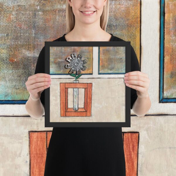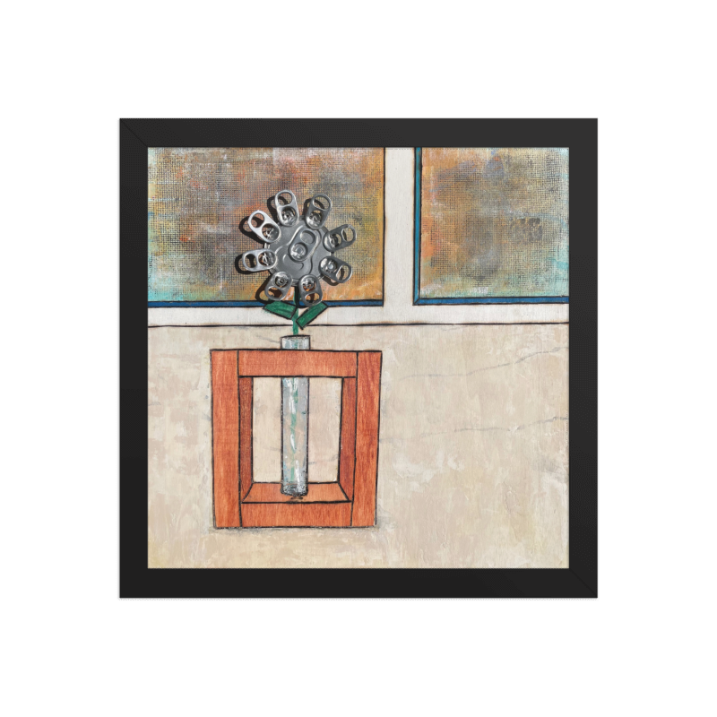 Print of original wood art panel with burning, acrylic, and beer can tops.